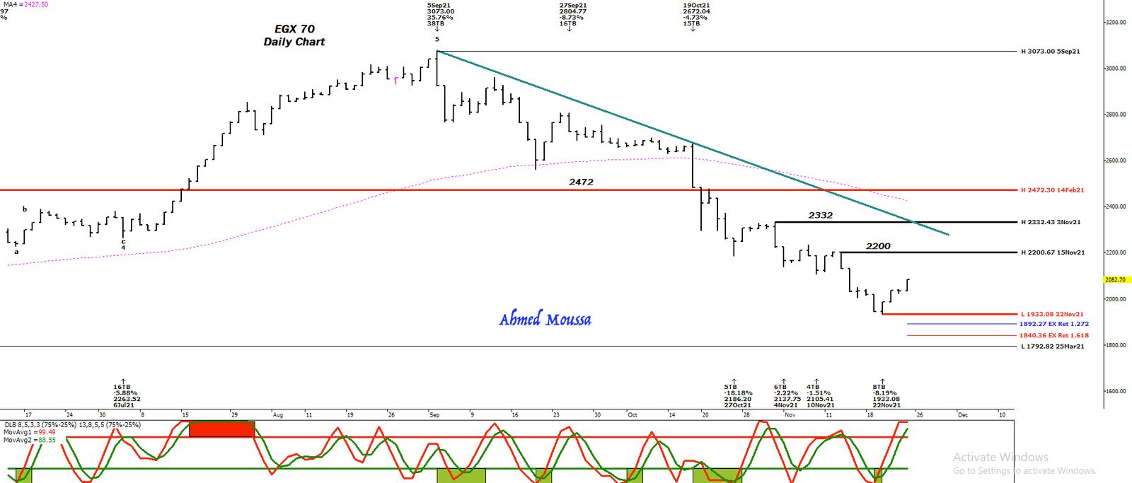 اما علي التدريج اليومي ،، ارتداد المؤشر من مستويات القاع الأخير 1933 ،، حتي الان جيد ولكن طالما لم نتجاوز مستويات 2200 كما موضح علي الشارت ،، يبقي حتي الان ترجيح ان مستويات 1933 هي القاع لم تتاكد ،،