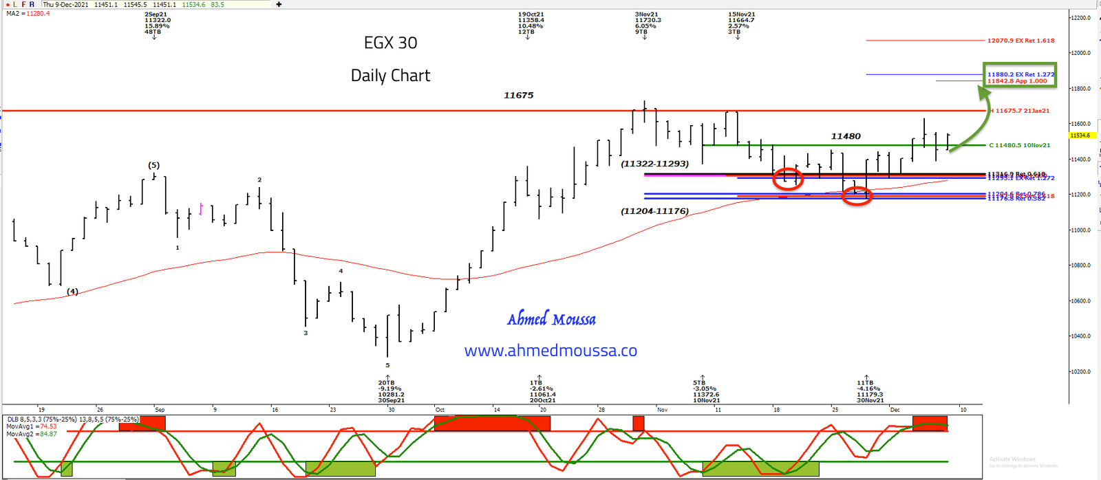 خلال جلسات الأسبوع الماضي استطاع المؤشر الاغلاق فوق مستوي 11480 وهو المستوي الذي حددته كشرط اساسي ويزيد الترجيح انتهاء الموجة الهابطة الحاليه ،