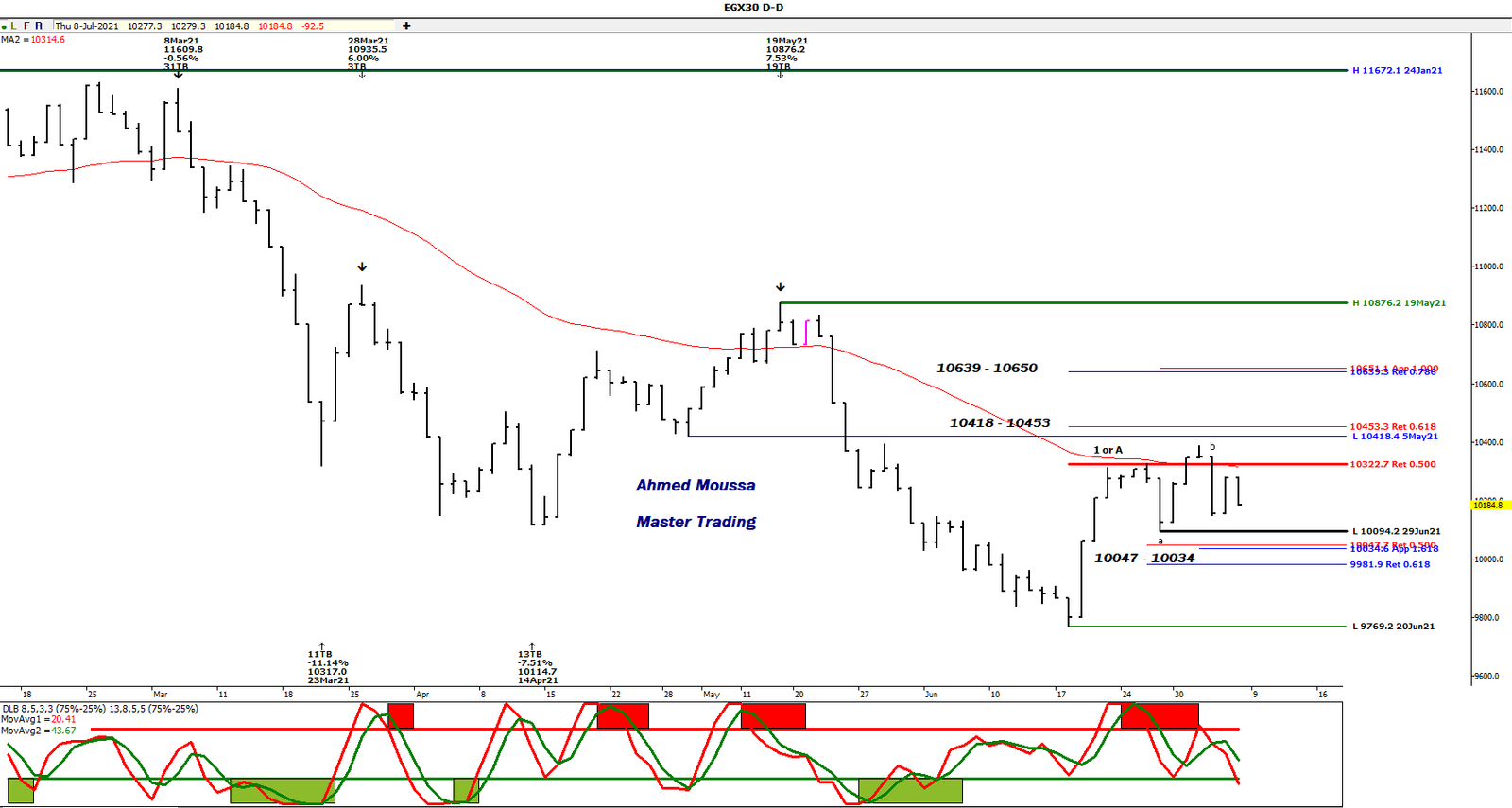 إعادة التداول مره أخرى داخل النطاق العرضي ما بين 10311 الي 10094 , يرجح بشكل كبير ان المؤشر مازال يتداول في نطاق الموجة التصحيحية للسوينج الصاعد الأخير من قاع 9769