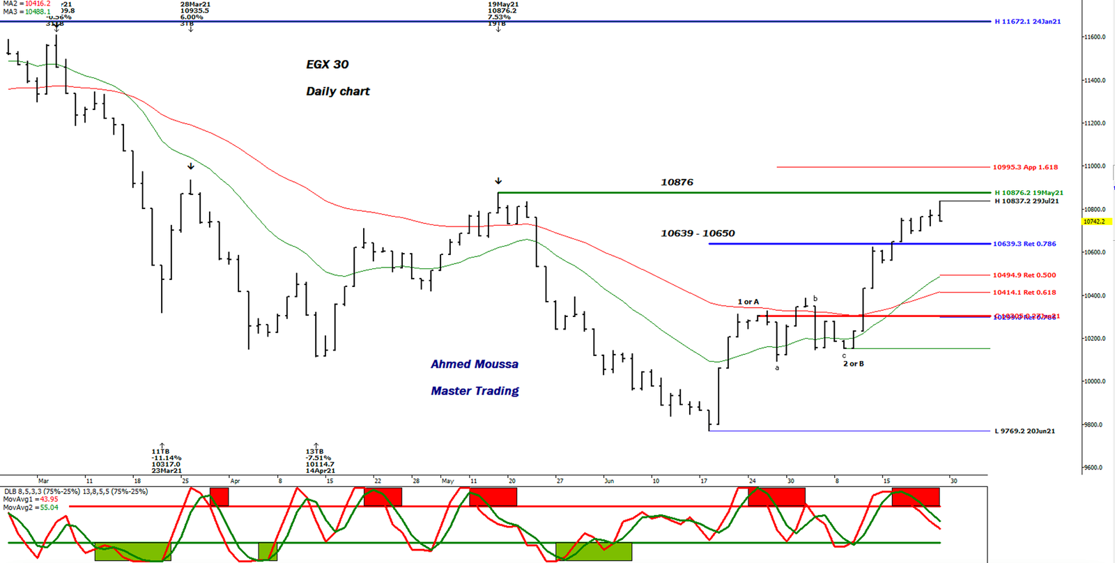 وقد اشرنا خلال التقارير السابقة الي اهميه مستوي ١٠٨٧٦ حيث ان الاستقرار أعلاه هو بداية تغير في السلوك الهابط للمؤشر علي المدي المتوسط ويفتح المجال الي بداية تكون ترند صاعد جديد
